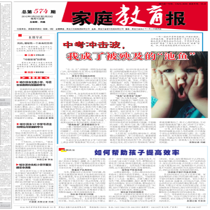 《家庭教育报》于1993年6月1日创刊,是一份由黑龙江报刊传媒股份有限公司主管、黑龙江报刊传媒集团有限公司主办,以家庭教育为主内容针对小学生、初中生、高中生和学生家长的专业行报纸。全国公开发行,是黑龙江省中、小学校家长指定教材,孩子和家长都爱读。 《家庭教育报》感染力强,服务贴近家庭、学校和社会,注重发挥服务家庭。学校和社会的强势。每期发行20多万份,拥有60多万读者。 《家庭教育报》国内统一刊号:CN23-0026,四开八版,彩色印刷,每周三出版。 |