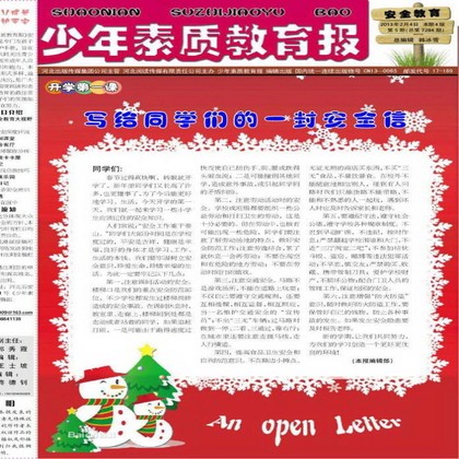 《少年素质教育报》是由河北出版传媒集团有限责任公司主管,河北阅读传媒有限责任公司主办的全国第一份以全面推进素质教育为主题的报纸。《少年素质教育报》于2000年1月正式创刊。国内统一刊号:CN13-0065。 《少年素质教育报》的基本读者对象为广大中小学生,兼顾教师、家长和教育工作者。创刊以来,始终秉承服务素质教育,提高少年素质的办报宗旨,始终全面贯彻党的教育方针,关注教育改革,宣传素质教育的思想和理念,报道素质教育中涌现的先进经验和典型。 |