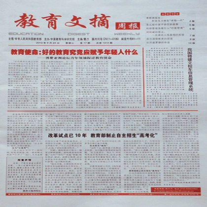 《教育文摘周报》(每周三出版,国内统一连续出版物号CN11-0180,邮发代号81-11)创刊于1984年,是由教育部主管、中国教育科学研究院主办的教育领域专业性文摘报,以精华摘要的形式转载高水平学术期刊、报纸等公开发表的文章。 欢迎一线教育工作者、教育科研人员以及广大关心教育事业发展的读者积极向我报推荐高水平教育主题类文章。 投稿要求 稿源包括国内公开出版的学术期刊、报纸、图书,各级教育部门官网、公众号文章等。 荐稿内容包括题目、正文、发表期刊及期数、作者姓名等。正文呈现原文中最精彩的内容或核心观点,字数500-1500字,附原文(Word或PDF格式)。 来稿以附件形式将摘编稿及原文发送至责编邮箱,邮件标题为“文章题目+投稿”。 可自荐本人文章,也可推荐他人文章。 编辑部对作者摘编内容有删修权,不同意删修稿件的作者请在来稿中声明。 |