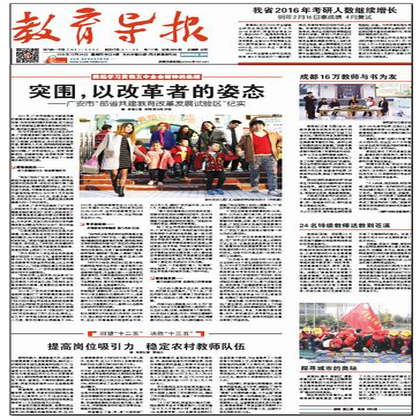 《教育导报》由四川教育报刊社主管、主办。《教育导报》自1988年1月创刊以来,以服务教育,服务学校,服务教师为宗旨,坚持以正面报道为主的方针,及时宣传党和国家的教育方针政策及省教委的工作部署,交流教育信息,反映教师呼声,拓宽教师视野,是了解四川教育发展和改革的窗口,是广大教育工作者自己的报纸,是广大教育工作者的好朋友。国内统一刊号:CN51-0052。 《教育导报》每周二、四、六出报。《教育导报·家教周刊》为周报,每周五出报。《教育导报》一、二版为新闻版,以刊登四川省教育系统重大新闻、及时消息、人物通讯等,以及全国性热点新闻事件评论为主;三版为理论版,以刊登教育教学研究、课改动向、教学前沿理论信息等为主;四版周刊化,以人物周刊、读书周刊、文学周刊(绿原)为主。 |